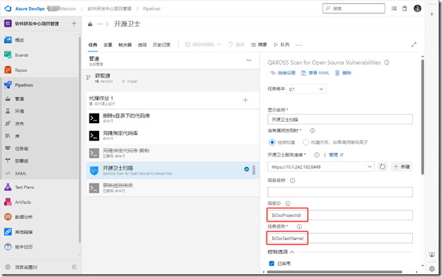 - 在流水线中,添加开源卫士的任务,其中使用了前面的项目ID、任务名称;同时还创建了一个连接到开源卫士服务器的服务连接,如下图