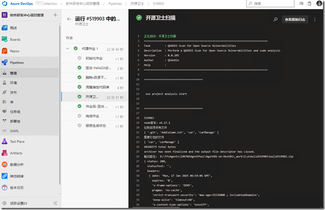 - 当上面的工作就绪后,就可以运行流水线,可以从流水线的运行记录中看到开源卫士的扫描过程和结果