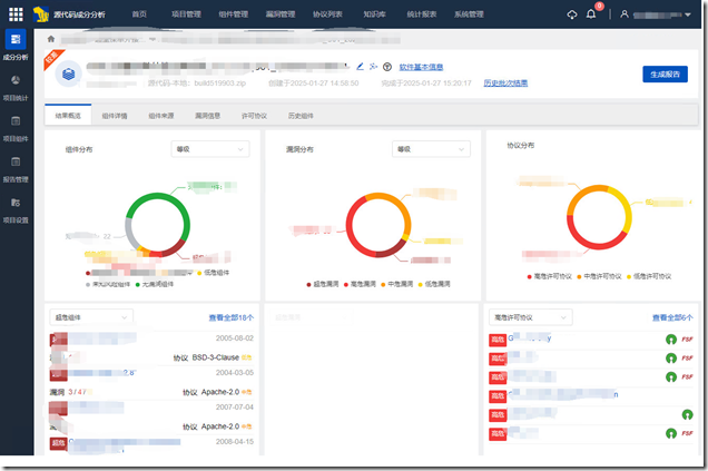 - 当扫描结束后,我们也可以在开源卫士服务器中查询到对应的详细结果;如果使用开源卫士提供的接口,我们还可以将结果、扫描报告等数据提取到第三方平台。