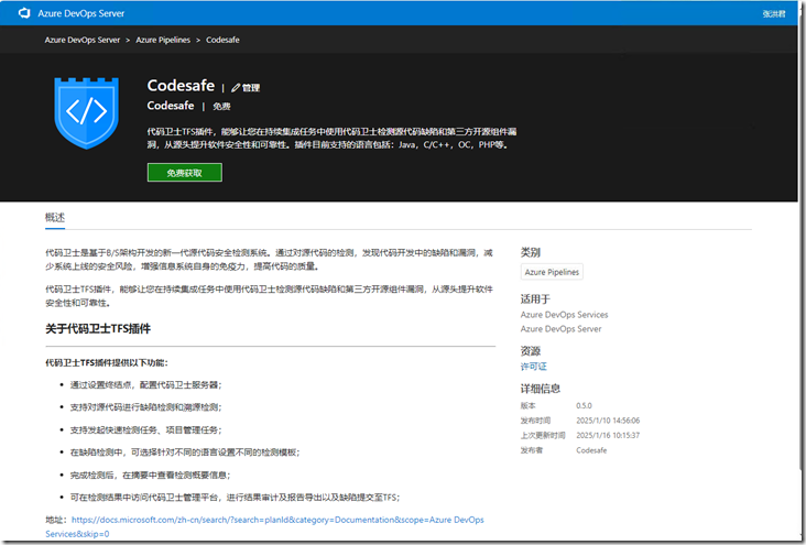 这个插件的安装介质大约有10MB左右,非常轻便;单安装完成插件后,我们可以在Azure DevOps Server中看到插件的详细介绍:
