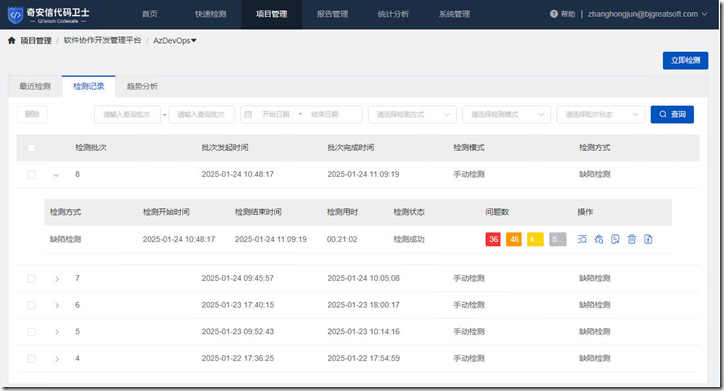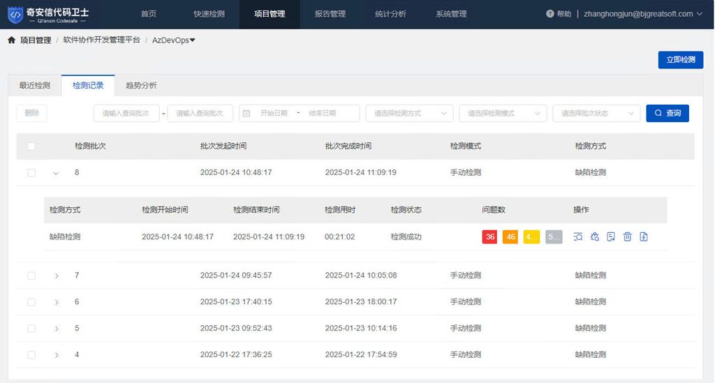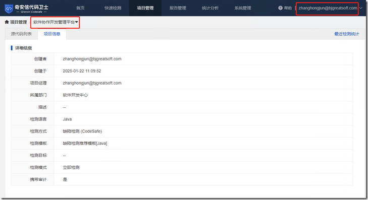 当扫描结束后,我们也可以在代码卫士服务器中查询到对应的详细结果;如果使用代码卫士提供的接口,我们还可以将结果、扫描报告等数据提取到第三方平台