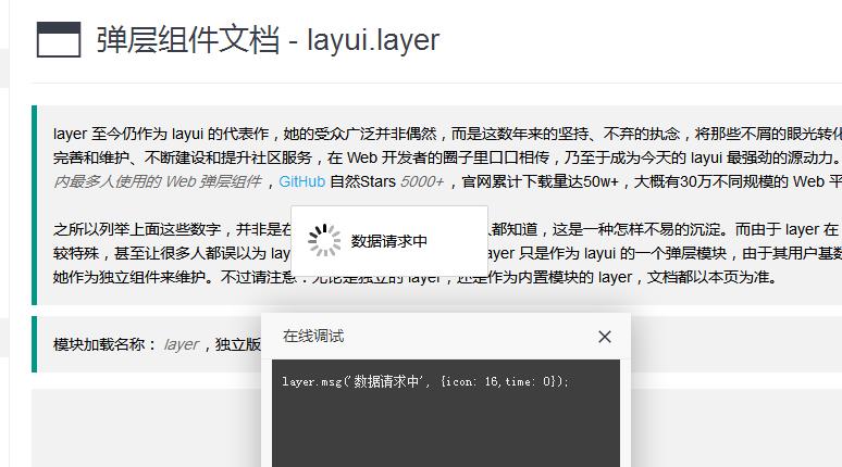 layer.msg('数据请求中', {icon: 16,time: 0});