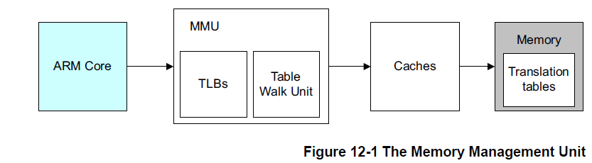 MMU 使用virtual 地址指向translation table,管理哪些block可以访问。地址转换由硬件自动完成,MMU 同时管理memory 访问权限、memory 保序规则、每个memory region 的cache police。