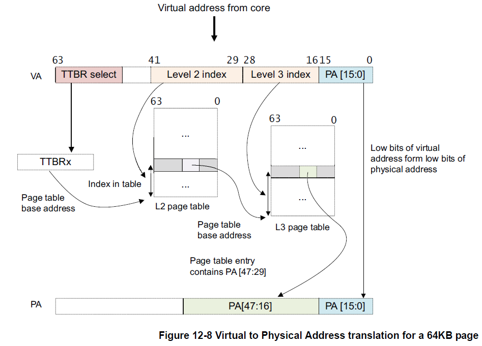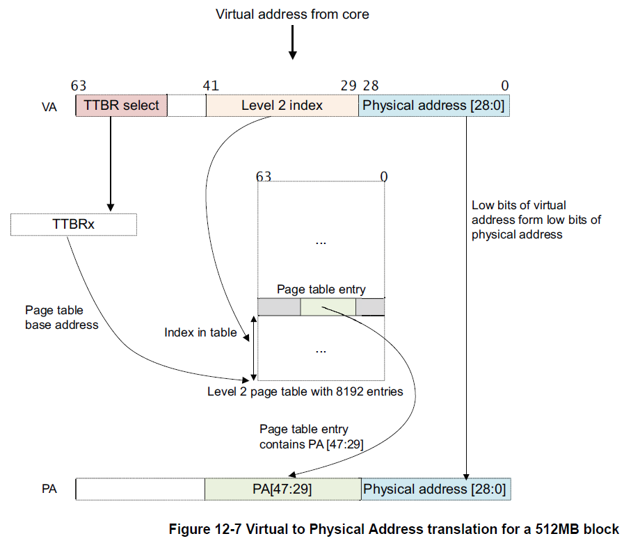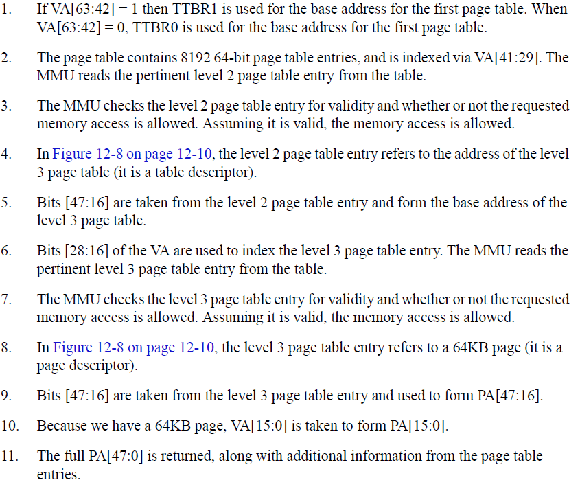 2、page table 包含8192个64bit 的page table entry,index 为VA[41:29],MMU读取第二级table entry;