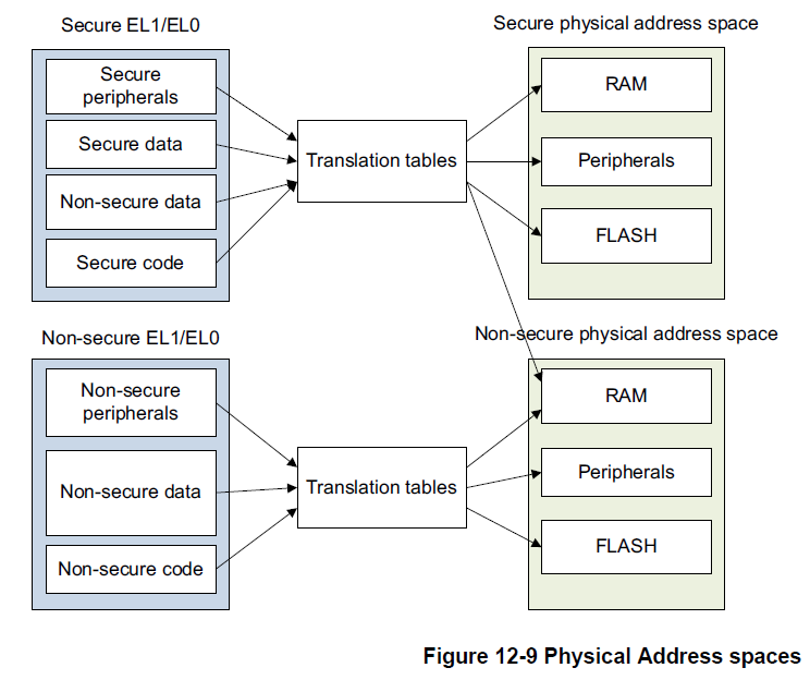 安全和非安全的PA空间是独立的,系统中设计Secure、Non-secure 通过控制访问实现,Normal 只能访问Non-secure PA空间,Secure 可以访问两者,这些都是通过translation table 实现。