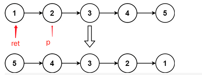 tmp临时量接受p.Next,让p的Next指向ret,然后让ret指向当前的p,再让p指向tmp(也就是原来的p的next),依次循环即可