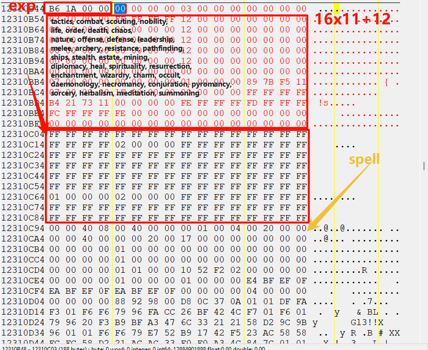 经验值(4字节)+12字节(正好这行满),其后整11行,再后面就是技能共9行,其后的24个字节就是魔法啦。如下就是一个例子: