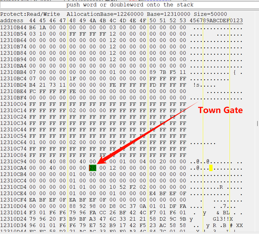 而魔法的每个字节有8位,每位为1就是有魔法,为0就是没有魔法,例如上面数据的20这个数据就是Town Gate。