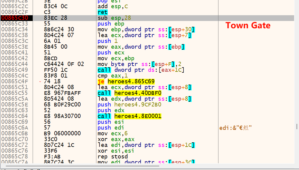 然而到了《英雄无敌》4这里,情况就变了!第一,没有城堡总数;第二,城堡的排序也不是固定的,而是将新占领的城堡插入在不知按照什么规律的位置,这两个变化几乎让你无法判断从哪里下手?再加之其子程序一个一个的嵌套,使得你不深入分析每个子程序的功能,就根本无法看清程序的作用!又何谈破解它呢?
