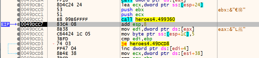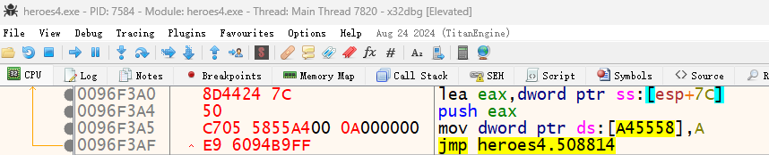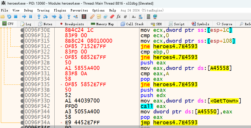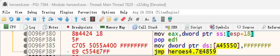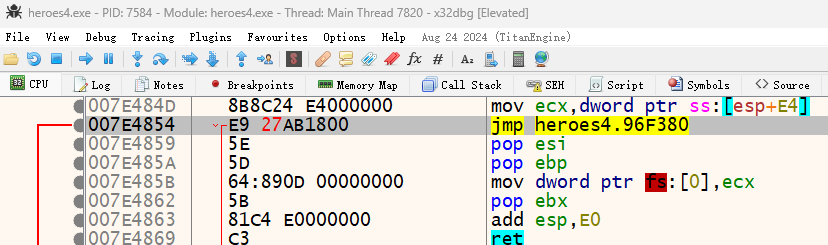 游戏中再次让英雄施放回城术,结果被断下。说明这确实是施放回城术的子程序中内容,让程序运行至return处再返回,找到它的调用者