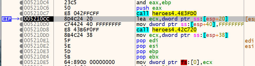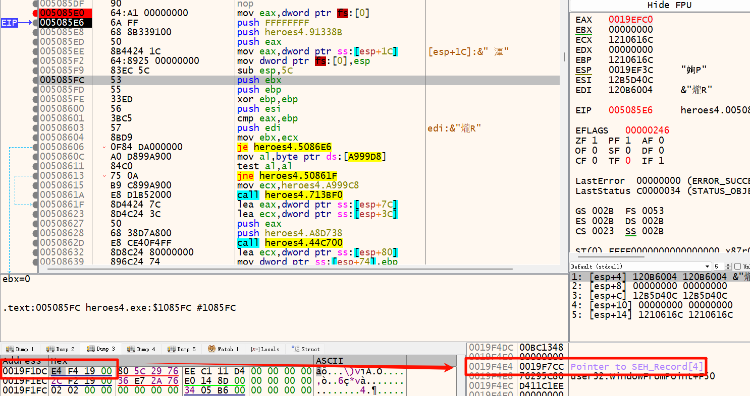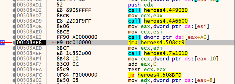 如果在上一图中继续return,则会出现到以前出现的子程序中了,所以,上一步找到的子程序5085E0就是回城术的