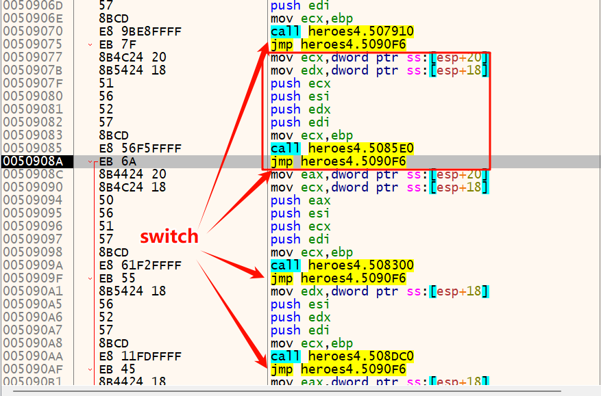 来到此处,可以看到,这是一个switch-case的结构,因此,刚刚调用的子程序就是回城术子程序