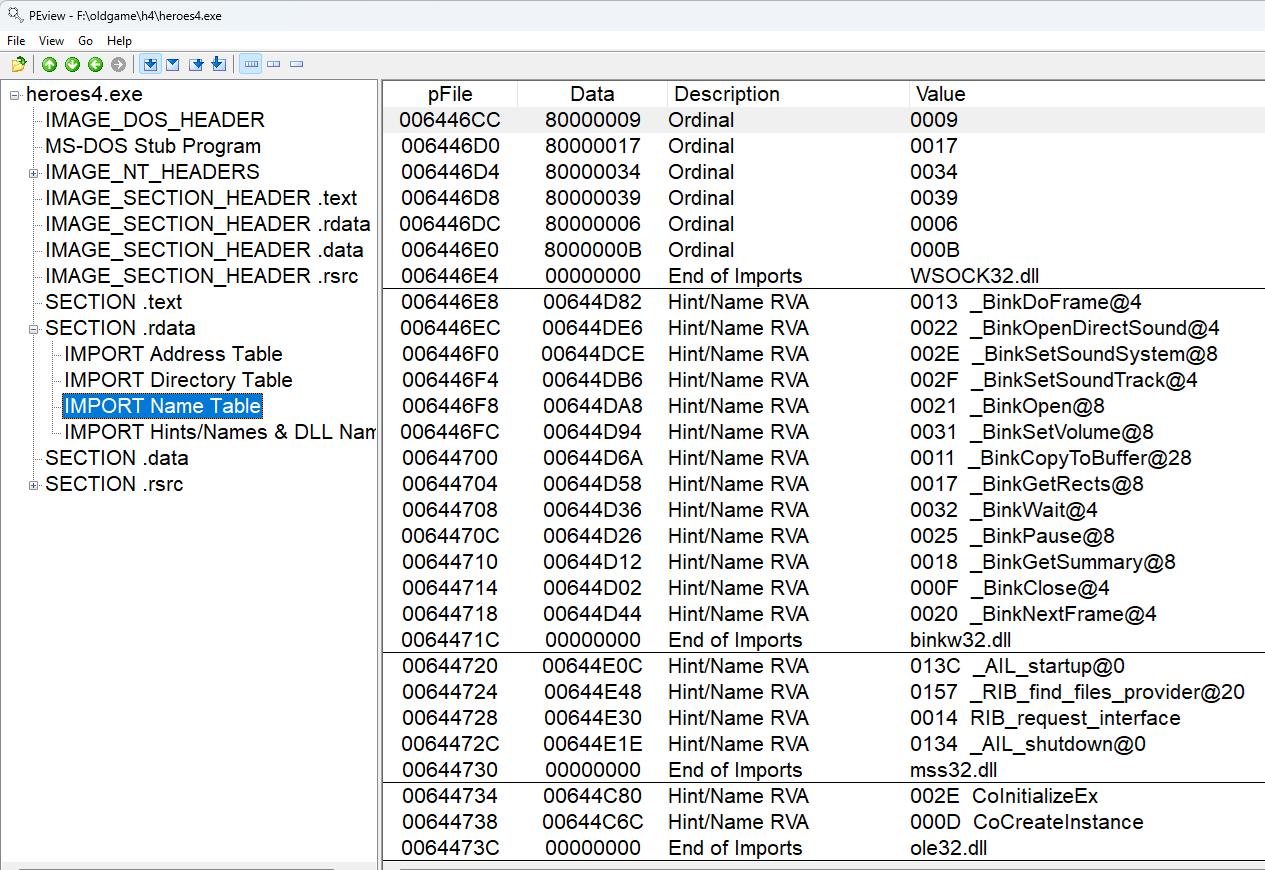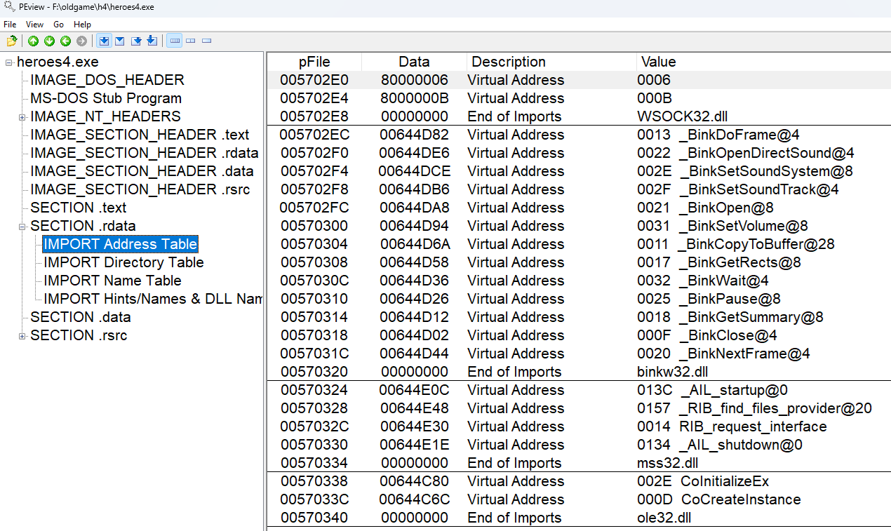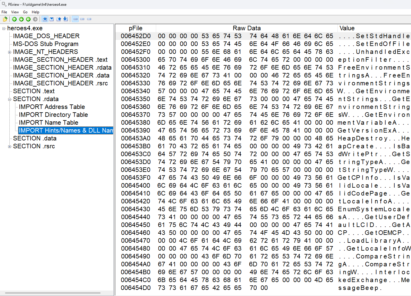 从下图可知,《英雄无敌》4中的DLL与函数名称是放在6552D0到6454E0区域的