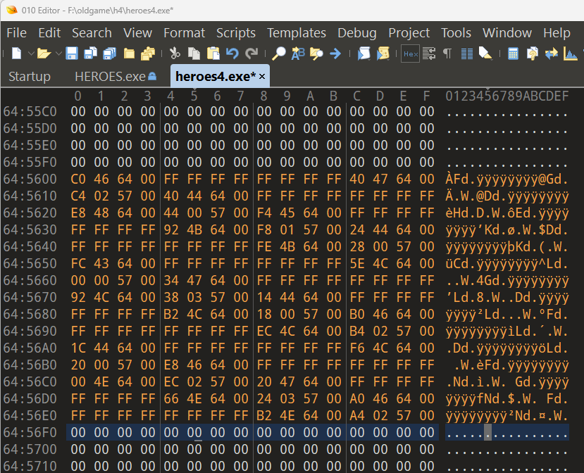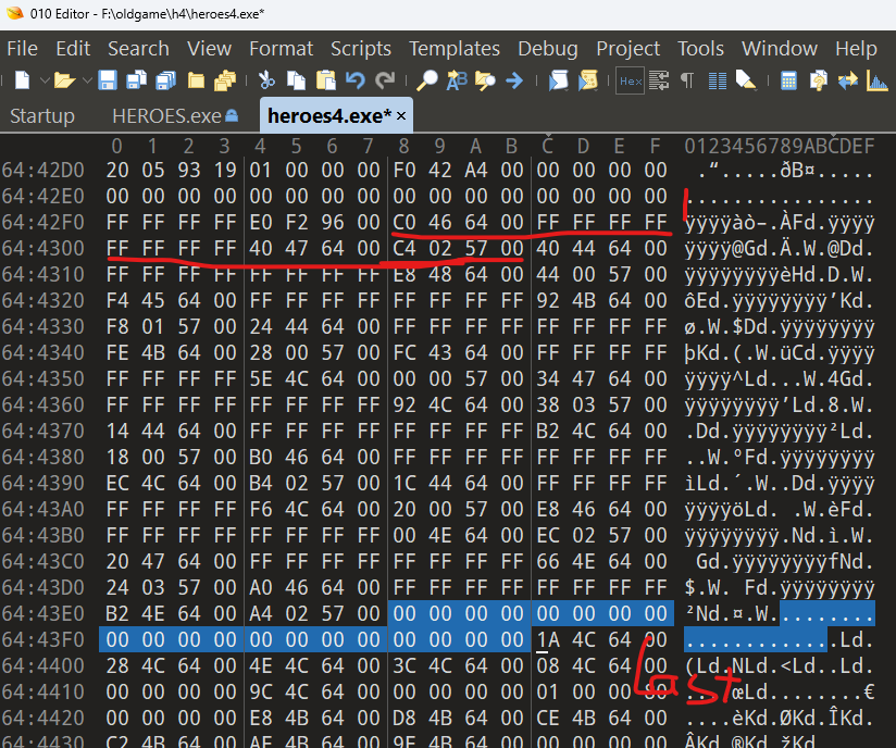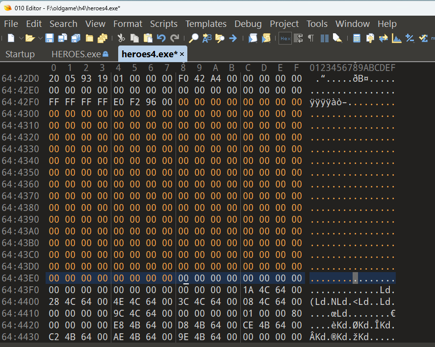 只好拿出CE,根据英雄的经验值搜索,得到英雄在内存中的数据,这些数据网络上有很多信息,可以知道英雄的技能、带的兵、装备、所学的魔法等。数据如下(以每行16字节显示):