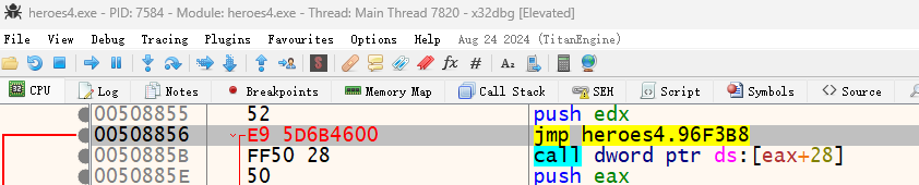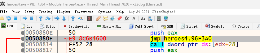 下面取消其它的断点,在5085E0下断,再施放回城术,果然被断下