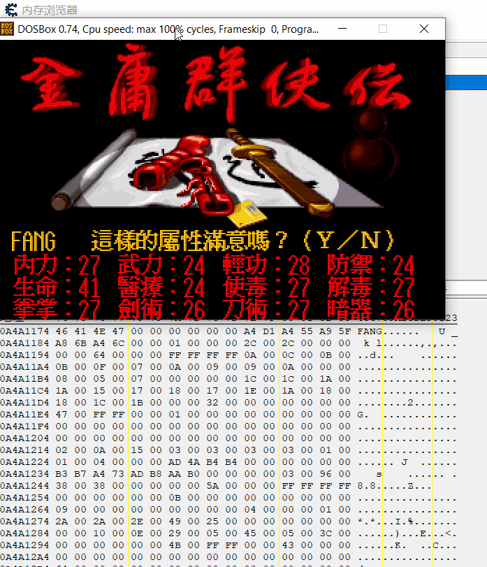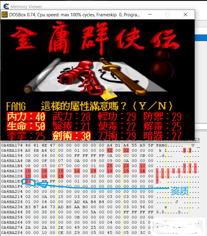 好,现在可以开始了。运行dosbox的《金庸群侠传》,输入角色名称,出现角色属性,此时打开CE如下图。