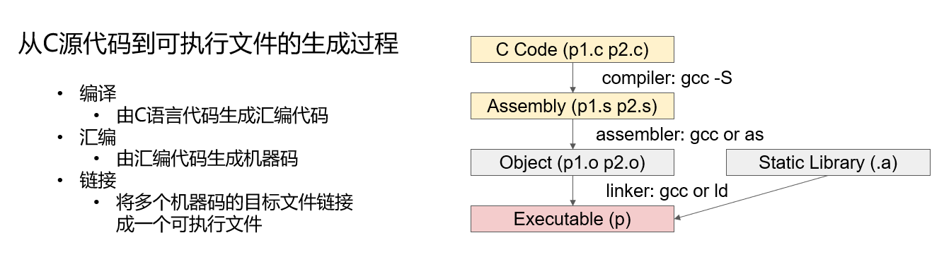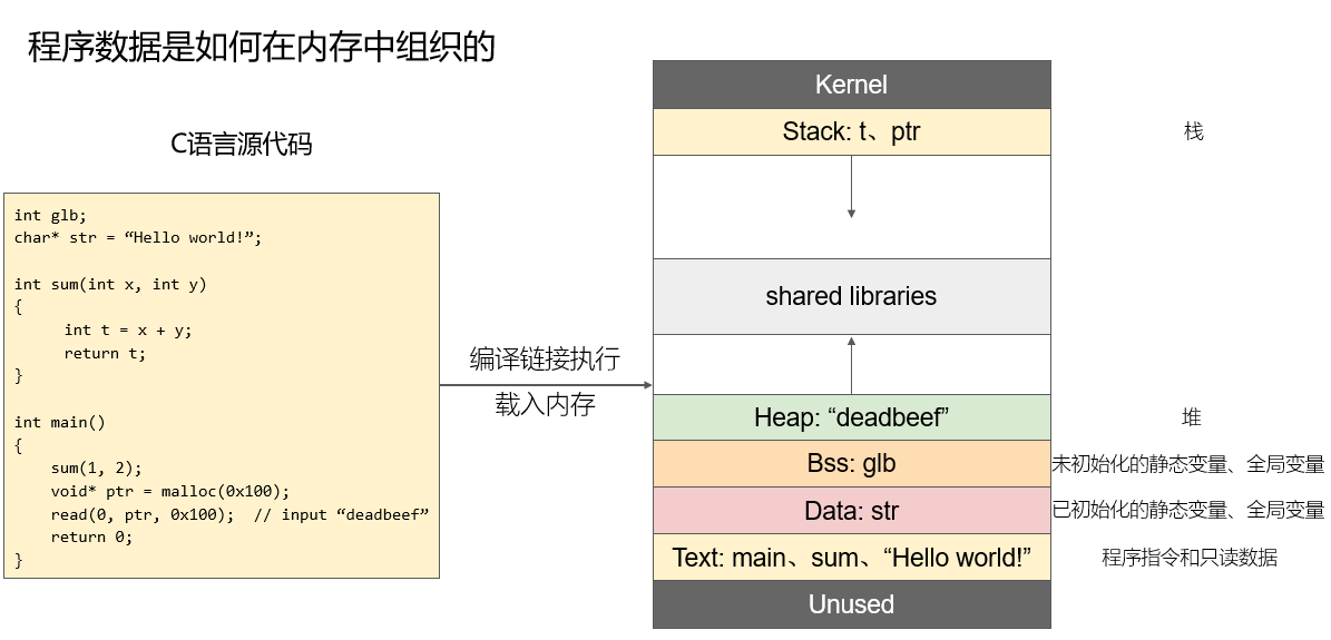 从图中可以看出C程序被编译成可执行文件执行时,它在内存中的存储情况。右侧是一个内存空间,地址由底部(低地址)逐渐升高。其中,最上层的kernel是操作系统的核心源码,他是操作系统完成各项功能的关键,最下层是保留区,这一部分我们暂时不做深入的研究。在早期的学习中,我们关注的是Stack(栈),Heap(堆),BSS(静态内存分配)。