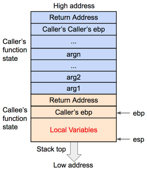逆序依次压入栈内。如果被调用函数(callee)不需要参数,则没有这一步骤。这些参数仍会保存在调用函数(caller)的函数状态内,之后压入栈内的数据都会作为被调用函数(callee)的函数状态来保存。 - 然后将调用函数(caller)进行调用之后的下一条指令地址作为返回地址压入栈内。这样调用函数(caller)的 eip(指令)信息得以保存。
