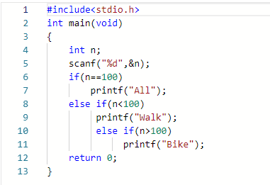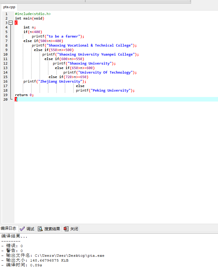 高考结束不久,各校的入取分数线也出来了,北京大学(Peking University)720,浙江大学(Zhejiang University)650,工业大学(University Of Technology)600,文理学院(Shaoxing University)550,文理学院元培学院(Shaoxing University Yuanpei College)500,绍兴职业技术学院(Shaoxing Vocational & Technical College)400,张三的分数为n,请问张三能去哪个大学? 如果分数低于400,则回家种地(to be a farmer)。很多学生都想知道自己能去哪个学校,求身为程序员的你帮帮他们。