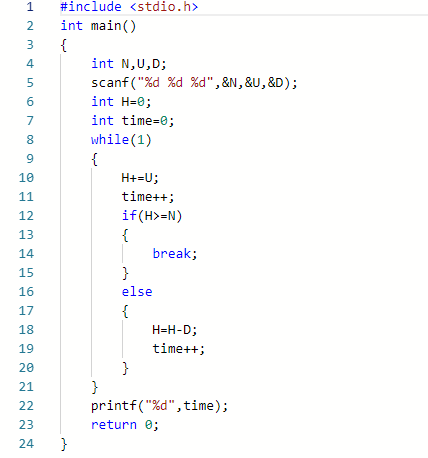 数据表达:我定义了整形变量N, U, D,time,N为井的深度,U为蠕虫爬的长度,D为蠕虫下滑的长度,time为蠕虫所爬行的时间。