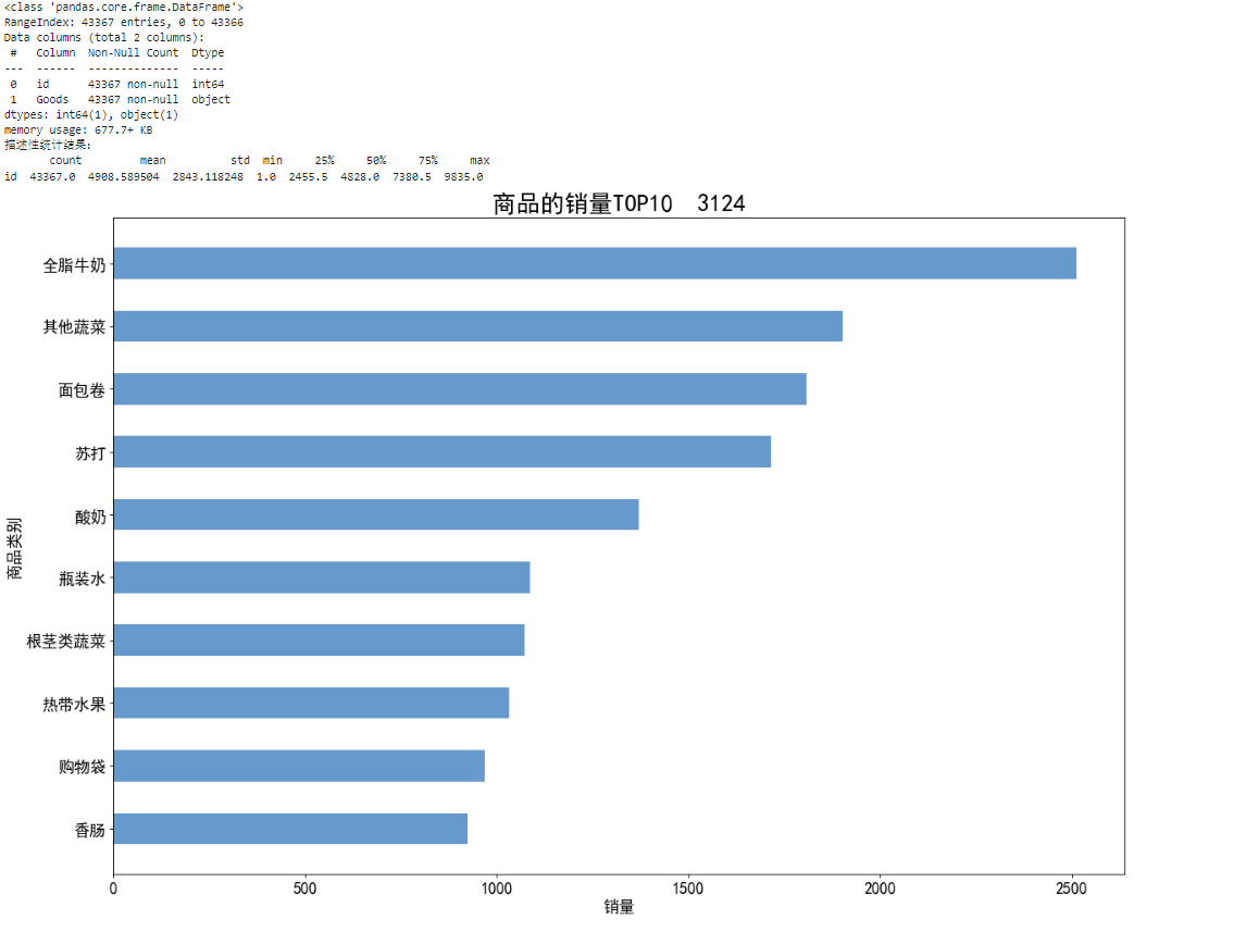 import numpy as np import pandas as pd import matplotlib.pyplot as plt plt.rcParams["font.sans-serif"] = ["SimHei"] plt.rcParams["axes.unicode_minus"] = False data =pd.read_csv(r"C:\Users\Lenovo\Desktop\GoodsOrder.csv",encoding = 'gbk') data.info() # 查看数据属性 print('描述性统计结果:\n',data.describe().T) # 对商品进行分类汇总 Top10 = data.groupby(['Goods']).count().reset_index() Top10 = Top10.sort_values('id',ascending=False) x = Top10[:10]['Goods'][::-1] y = Top10[:10]['id'][::-1] plt.figure(figsize=(18,12), dpi=80) plt.barh(x, y, height=0.5, color='#6699CC') plt.xlabel('销量',size=16) plt.ylabel('商品类别',size=16) plt.title('商品的销量TOP10 3124', size=24) plt.xticks(size=16) # x轴字体大小调整 plt.yticks(size=16) # y轴字体大小调整 plt.show()