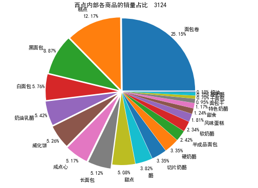 data_nums = data.shape[0] for index, row in Top10[:10].iterrows(): print(row['Goods'],row['id'],row['id']/data_nums) inputfile1 = r"C:\Users\Lenovo\Desktop\GoodsOrder.csv" inputfile2 = r"C:\Users\Lenovo\Desktop\GoodsTypes.csv" data=pd.read_csv(inputfile1,encoding='gbk') types=pd.read_csv(inputfile2,encoding='gbk') group=data.groupby(['Goods']).count().reset_index() sort=group.sort_values('id',ascending=False).reset_index() del sort['index'] sort_links=pd.merge(sort,types) sort_link=sort_links.groupby(['Types']).sum().reset_index() sort_link=sort_link.sort_values('id',ascending=False).reset_index() selected = sort_links.loc[sort_links['Types'] == '西点'] # 对所有的“非酒精饮料”求和 child_nums = selected['id'].sum() # 求百分比 selected.loc[:,'child_percent'] = selected.apply(lambda line: line['id']/child_nums,axis = 1) selected.rename(columns = {'id':'count'},inplace = True) print('西点内部商品的销量及其占比:\n',selected) outfile2 = r"C:\Users\Lenovo\Desktop\child_percent.csv" sort_link.to_csv(outfile2,index = False,header = True,encoding='gbk') # 输出结果 data = selected['child_percent'] labels = selected['Goods'] plt.figure(figsize = (8,6)) # 设置每一块分割出的间隙大小 explode = (0.02,0.03,0.04,0.05,0.06,0.07,0.08,0.08,0.02,0.02,0.02,0.02,0.02,0.02,0.02,0.02,0.02,0.02,0.02,0.02,0.02) plt.pie(data,explode = explode,labels = labels,autopct = '%1.2f%%', pctdistance = 1.1,labeldistance = 1.2) # 设置标题 plt.title("西点内部各商品的销量占比 3124") # 把单位长度都变的一样 plt.axis('equal') # 保存图形 # plt.savefig('./child_persent.png') plt.show()