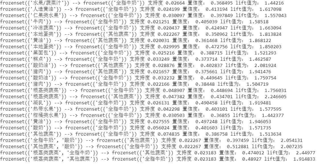 from numpy import * def loadDataSet(): return [['a', 'c', 'e'], ['b', 'd'], ['b', 'c'], ['a', 'b', 'c', 'd'], ['a', 'b'], ['b', 'c'], ['a', 'b'], ['a', 'b', 'c', 'e'], ['a', 'b', 'c'], ['a', 'c', 'e']] def createC1(dataSet): C1 = [] for transaction in dataSet: for item in transaction: if not [item] in C1: C1.append([item]) C1.sort() # 映射为frozenset唯一性的,可使用其构造字典 return list(map(frozenset, C1)) # 从候选K项集到频繁K项集(支持度计算) def scanD(D, Ck, minSupport): ssCnt = {} for tid in D: # 遍历数据集 for can in Ck: # 遍历候选项 if can.issubset(tid): # 判断候选项中是否含数据集的各项 if not can in ssCnt: ssCnt[can] = 1 # 不含设为1 else: ssCnt[can] += 1 # 有则计数加1 numItems = float(len(D)) # 数据集大小 retList = [] # L1初始化 supportData = {} # 记录候选项中各个数据的支持度 for key in ssCnt: support = ssCnt[key] / numItems # 计算支持度 if support >= minSupport: retList.insert(0, key) # 满足条件加入L1中 supportData[key] = support return retList, supportData def calSupport(D, Ck, min_support): dict_sup = {} for i in D: for j in Ck: if j.issubset(i): if not j in dict_sup: dict_sup[j] = 1 else: dict_sup[j] += 1 sumCount = float(len(D)) supportData = {} relist = [] for i in dict_sup: temp_sup = dict_sup[i] / sumCount if temp_sup >= min_support: relist.append(i) # 此处可设置返回全部的支持度数据(或者频繁项集的支持度数据) supportData[i] = temp_sup return relist, supportData # 改进剪枝算法 def aprioriGen(Lk, k): retList = [] lenLk = len(Lk) for i in range(lenLk): for j in range(i + 1, lenLk): # 两两组合遍历 L1 = list(Lk[i])[:k - 2] L2 = list(Lk[j])[:k - 2] L1.sort() L2.sort() if L1 == L2: # 前k-1项相等,则可相乘,这样可防止重复项出现 # 进行剪枝(a1为k项集中的一个元素,b为它的所有k-1项子集) a = Lk[i] | Lk[j] # a为frozenset()集合 a1 = list(a) b = [] # 遍历取出每一个元素,转换为set,依次从a1中剔除该元素,并加入到b中 for q in range(len(a1)): t = [a1[q]] tt = frozenset(set(a1) - set(t)) b.append(tt) t = 0 for w in b: # 当b(即所有k-1项子集)都是Lk(频繁的)的子集,则保留,否则删除。 if w in Lk: t += 1 if t == len(b): retList.append(b[0] | b[1]) return retList def apriori(dataSet, minSupport=0.2): # 前3条语句是对计算查找单个元素中的频繁项集 C1 = createC1(dataSet) D = list(map(set, dataSet)) # 使用list()转换为列表 L1, supportData = calSupport(D, C1, minSupport) L = [L1] # 加列表框,使得1项集为一个单独元素 k = 2 while (len(L[k - 2]) > 0): # 是否还有候选集 Ck = aprioriGen(L[k - 2], k) Lk, supK = scanD(D, Ck, minSupport) # scan DB to get Lk supportData.update(supK) # 把supk的键值对添加到supportData里 L.append(Lk) # L最后一个值为空集 k += 1 del L[-1] # 删除最后一个空集 return L, supportData # L为频繁项集,为一个列表,1,2,3项集分别为一个元素 # 生成集合的所有子集 def getSubset(fromList, toList): for i in range(len(fromList)): t = [fromList[i]] tt = frozenset(set(fromList) - set(t)) if not tt in toList: toList.append(tt) tt = list(tt) if len(tt) > 1: getSubset(tt, toList) def calcConf(freqSet, H, supportData, ruleList, minConf=0.7): for conseq in H: #遍历H中的所有项集并计算它们的可信度值 conf = supportData[freqSet] / supportData[freqSet - conseq] # 可信度计算,结合支持度数据 # 提升度lift计算lift = p(a & b) / p(a)*p(b) lift = supportData[freqSet] / (supportData[conseq] * supportData[freqSet - conseq]) if conf >= minConf and lift > 1: print(freqSet - conseq, '-->', conseq, '支持度', round(supportData[freqSet], 6), '置信度:', round(conf, 6), 'lift值为:', round(lift, 6)) ruleList.append((freqSet - conseq, conseq, conf)) # 生成规则 def gen_rule(L, supportData, minConf = 0.7): bigRuleList = [] for i in range(1, len(L)): # 从二项集开始计算 for freqSet in L[i]: # freqSet为所有的k项集 # 求该三项集的所有非空子集,1项集,2项集,直到k-1项集,用H1表示,为list类型,里面为frozenset类型, H1 = list(freqSet) all_subset = [] getSubset(H1, all_subset) # 生成所有的子集 calcConf(freqSet, all_subset, supportData, bigRuleList, minConf) return bigRuleList if __name__ == '__main__': dataSet = data_translation L, supportData = apriori(dataSet, minSupport = 0.02) rule = gen_rule(L, supportData, minConf = 0.35)