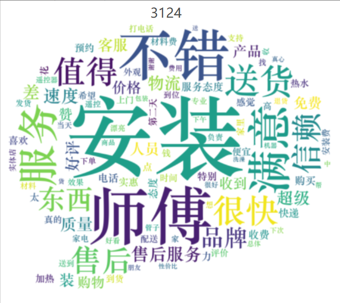 # 代码12-5 绘制词云 import matplotlib.pyplot as plt from wordcloud import WordCloud frequencies = result.groupby(by = ['word'])['word'].count() frequencies = frequencies.sort_values(ascending = False) backgroud_Image=plt.imread('D:\JupyterLab-Portable-3.1.0-3.9\新建文件夹\第十二章\pl.jpg') wordcloud = WordCloud(font_path="C:\Windows\Fonts\STZHONGS.ttf", max_words=100, background_color='white', mask=backgroud_Image) my_wordcloud = wordcloud.fit_words(frequencies) plt.imshow(my_wordcloud) plt.axis('off') plt.title('3124') plt.show() # 将结果写出 result.to_csv("D:/python123/word.csv", index = False, encoding = 'utf-8')
