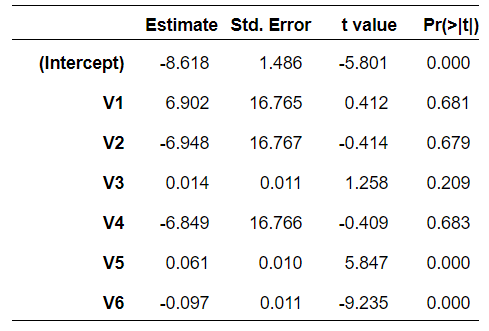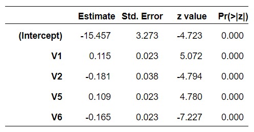 由于该数据的变量V6有出错信息,但我们又不愿意去掉该变量,因此代码中改用probit选项,此时不能计算AIC,也不能用逐步回归选择变量,但还是用BI()函数选择阈值