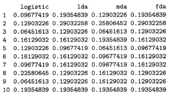 运行logistic、lda、mda、fda判别分析的交叉验证,代码如下: