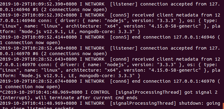 在终端控制台输入如下语句,出现一些warning没有关系,出现一些collections accept字样就说明数据库连接成功了(终端不要关闭)