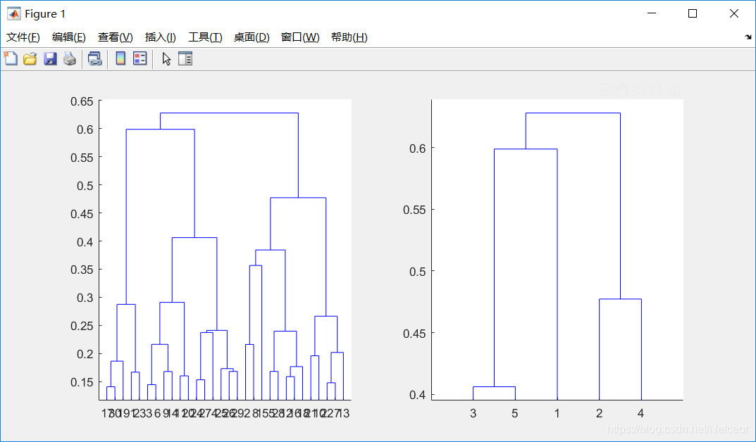 - dendrogram(Z) %绘制系统聚类图