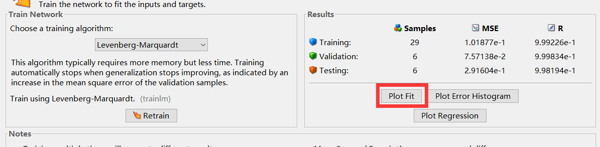 6.Train Network窗中,按Train,训练完成后,Plot Fit可查看拟合程度。按Next