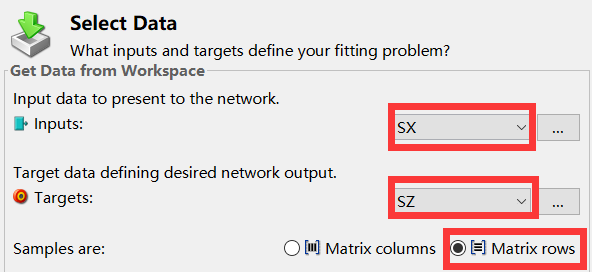 3.Select Data窗中Input框中选SX,Targets框中选SZ;设置Matrix rows;按Next