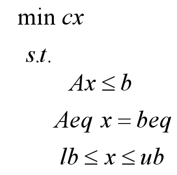 [x,fval,exitflag,output,lambda] =linprog(c,A,b,Aeq,beq,lb,ub,x0,options)
