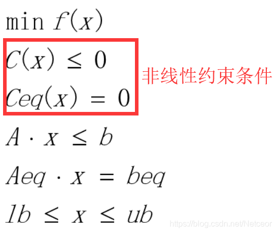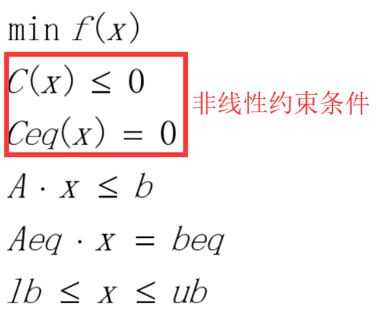 - 其中nonlcon为非线性约束及导数:[C,Ceq,gC,gCeq]=nonlcon(x);