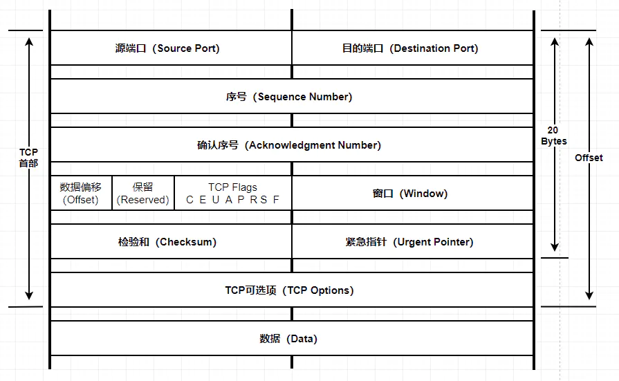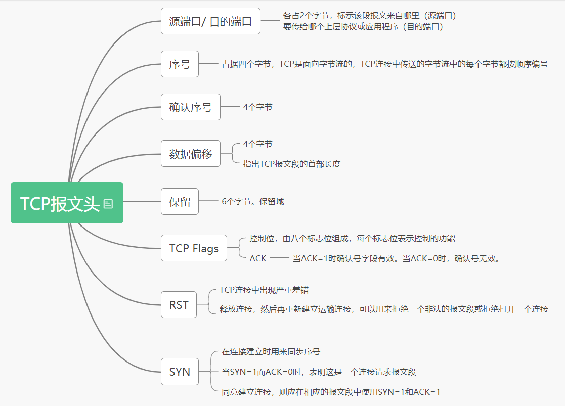 - 标志位:共6个,即URG、ACK、PSH、RST、SYN、FIN等