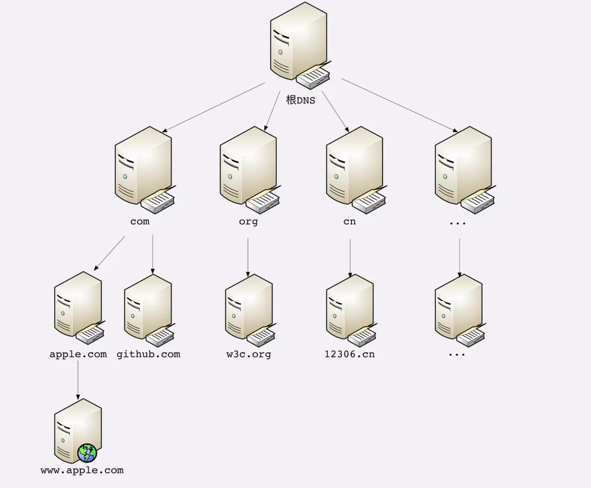 - 从顶级域名服务器查到次级域名服务器的NS记录和A记录,IP地址