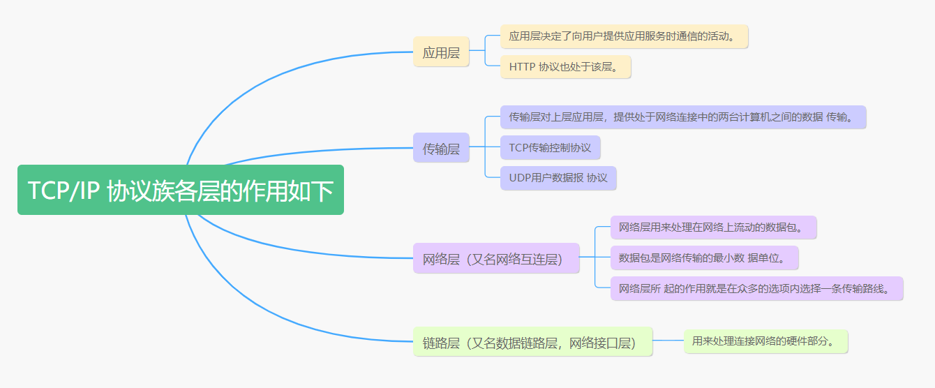 客户端(浏览器)在地址栏访问某域名网页,向DNS要求发送给对应的IP地址,浏览器通过域名在网页请求某域名下的页面资源,HTTP协议会生成对目标web服务器的HTTP的请求报文。TCP协议就是将HTTP请求报文分割成报文段,可靠地传给对方。通过(数据包中转站)IP协议负责的地方,搜索对方某MAC地址路由器,一边中转一边传送。到达对方服务器(某Ip地址),TCP协议负责从对方接收接收过来的报文段,重组到达按序号以原来的顺序,HTTP协议就对web服务器请求的内容进行处理。