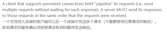仅在HTTP/1.1才支持管线化,在持久连接前提下,请求一次性打包传输过去,响应一次性打包传递回来。