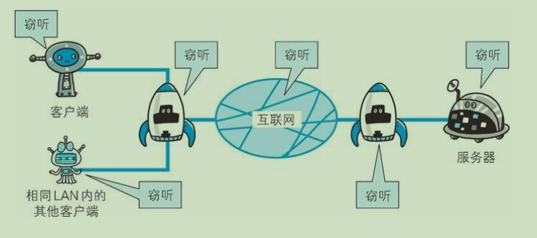 - 通信使用明文可能会被窃听,存在通信内容被窃听的风险