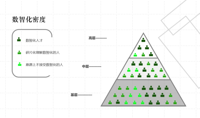 数字化人才梯队建设分三层,一层是高管,一层是中层,一层是基层。就像我们现在这个图里面(如下图)所看到的一样,一个企业里面,从高层、中层、基层看,这里面绿色代表是已经系统性的了解了数字化转型,然后黄色是代表碎片化的了解,红色代表不愿意了解。这几个人的作用和分工是什么呢?高层其实是制定数字化转型的战略和具体的策略,以及验收最终的结果。而中层是基于这个战略和策略理解了以后做数字化的产品,基于场景和开发不同场景的数字化的产品和工具来支撑一线员工进行数字化转型。这是数字化中层想做的事情。这一层的人往往需要对行业比较了解,有数字化产品经理的意识,这是第二层。第三层,是基层人员,他利用各种市面上的数据中台,业务中层,各种买的工具来制作数字化的产品,去实现数字化的应用。更多不是说去写代码,做技术,而是快速理解业务,用数据的思维去把数字化产品做出来,或者是说他做一些基本的分析、挖掘、数据处理等等工作,把日常的数据提速,数据分析工作做完。也就是说,一个公司想数字化转型成功,需要高层、中层、基层上下同心。