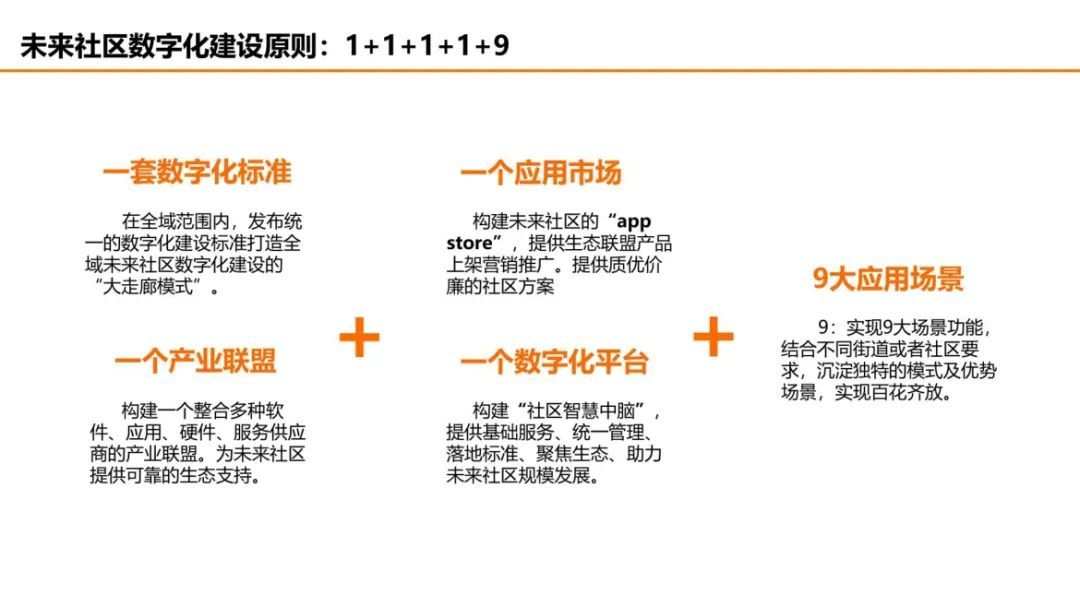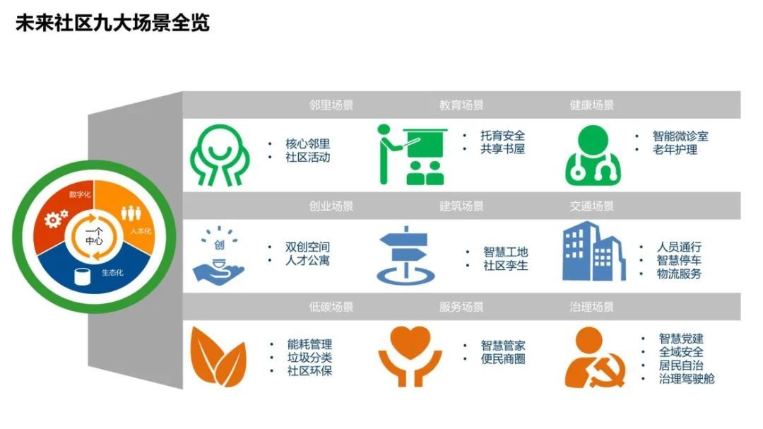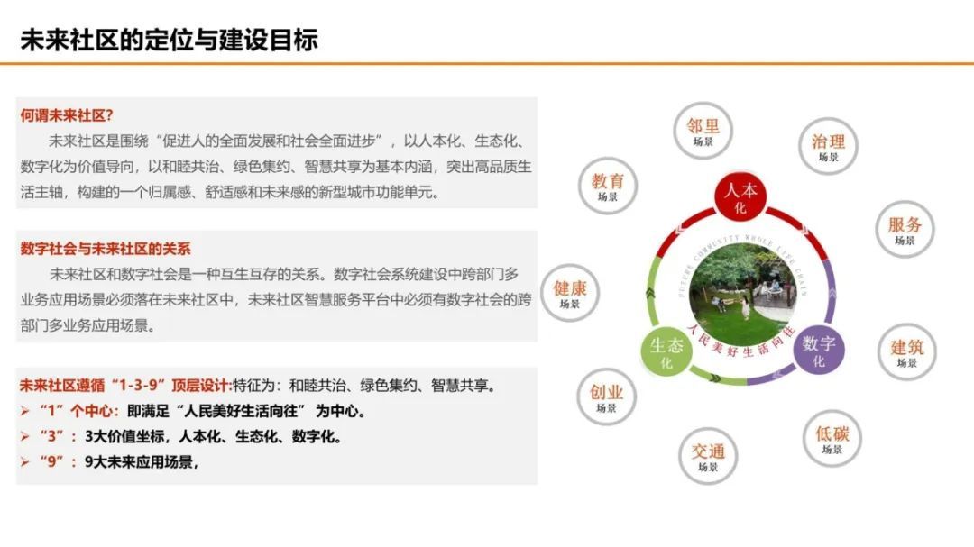 未来社区遵循“1-3-9”顶层设计:特征为:和睦共治、绿色集约、智慧共享。1个中心:即满足“人民美好生活向往”为中心。3大价值坐标,人本化、生态化、数字化。9大未来应用场景。