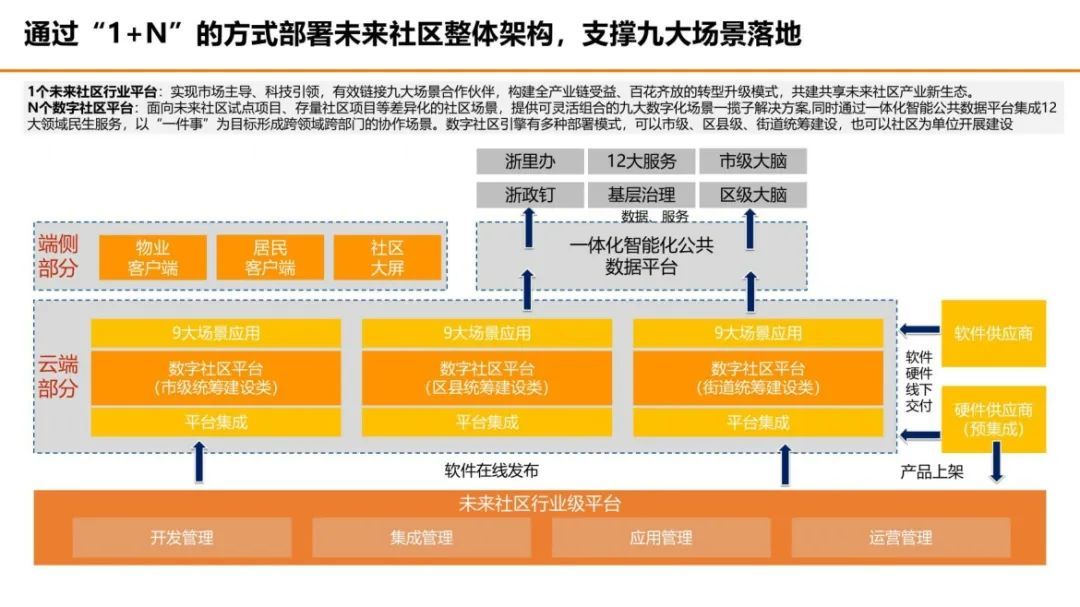通过1+N的方式部署未来社区整体架构,支撑九大场景落地。1个未来社区行业平台:实现市场主导、科技引领,有效链接九大场景合作伙伴,构建全产业链受益、百花齐放的转型升级模式,共建共享未来社区产业新生态。N个数字社区平台:面向未来社区试点项目、存量社区项目等差异化的社区场景,提供可灵活组合的九大数字化场景一揽子解决方案,同时通过一体化智能公共数据平台集成12大领域民生服务,以一件事为目标形成跨领域跨部门的协作场景。数字社区引擎有多种部署模式,可以市级、区县级、街道统筹建设,也可以社区为单位开展建设。
