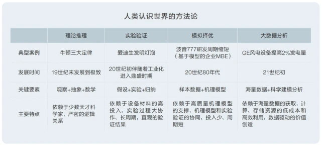 人类社会认识客观世界的方法论已经历了四个阶段,从“观察+抽象+数学”的理论推理阶段,到“假设+实验+归纳”的实验验证阶段,再到“样本数据+机理模型”的模拟择优阶段,目前已进入“海量数据+科学建模分析”的大数据阶段,就是采用“数据+算法”的模式,通过大数据去发现物理世界的新规律。
