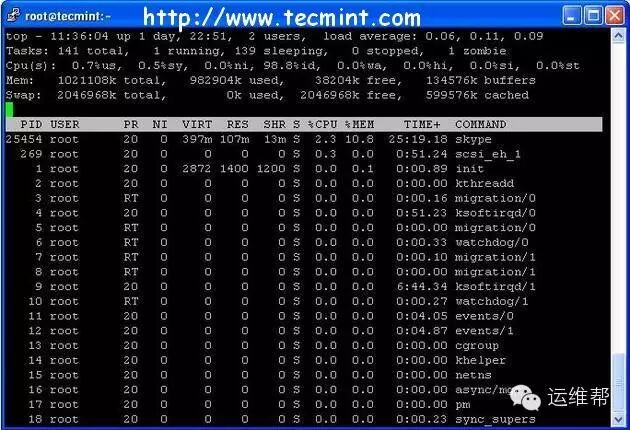 top 命令是性能监控程序,它可以在很多 Linux/Unix 版本下使用,并且它也是 Linux 系统管理员经常使用的监控系统性能的工具。Top 命令可以定期显示所有正在运行和实际运行并且更新到列表中,它显示出 CPU 的使用、内存的使用、交换内存、缓存大小、缓冲区大小、过程控制、用户和更多命令。它也会显示内存和 CPU 使用率过高的正在运行的进程。当我们对 Linux 系统需要去监控和采取正确的行动时,top 命令对于系统管理员是非常有用的。让我们看下 top 命令的实际操作。
