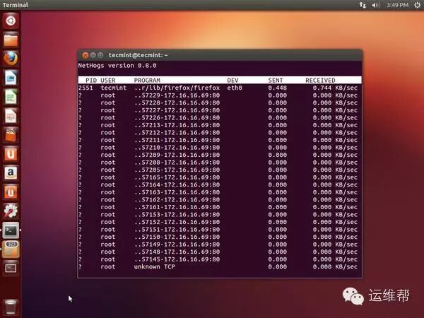 NetHogs 是一个开源的漂亮的小程序(类似于 Linux 上面的 top 命令),在您的系统上保持每个进程的网络活动状态。它也保持了一个程序或者应用实时的网络流量带宽使用情况。