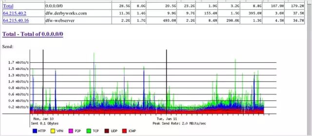 iptraf 收集的各种指标,如 TCP 连接数据包和字节数,端口统计和活动指标,TCP/UDP 通信故障,站内数据包和字节数。