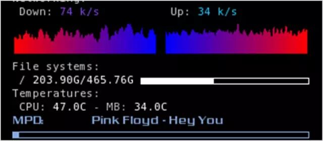 Conky 能监视很多的操作系统数据。它支持 IMAP 和 POP3, 甚至许多流行的音乐播放器!出于方便不同的人,你可以使用自己的 Lua 脚本或程序来进行扩展。
