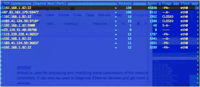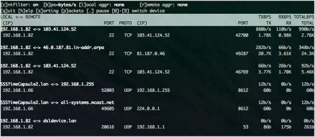 iftop 类似于 top,但它主要不是检查 cpu 的使用率而是监听所选择网络接口的流量,并以表格的形式显示当前的使用量。像“为什么我的网速这么慢呢?!”这样的问题它可以直接回答。